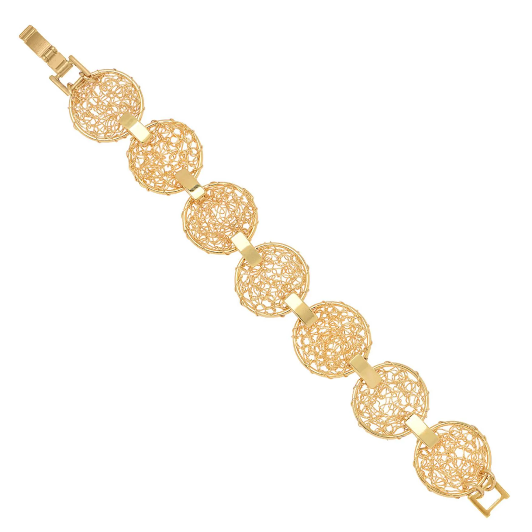 A técnica do crochê é ancestral, porém as duas versões com crochê de buriti e com cobre banhado a ouro e formas geométricas redondas, conferem aos conjuntos contemporaneidade e modernidade.