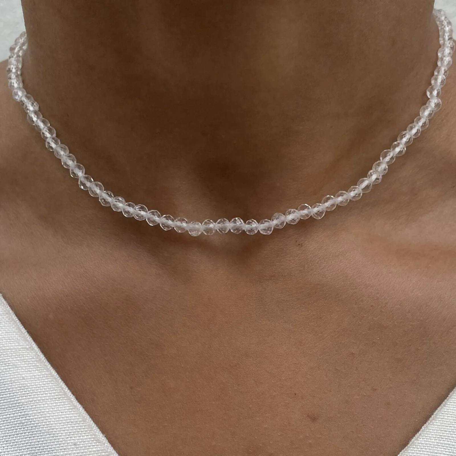 Chocker em esferas com pedra natural quartzo cristal.