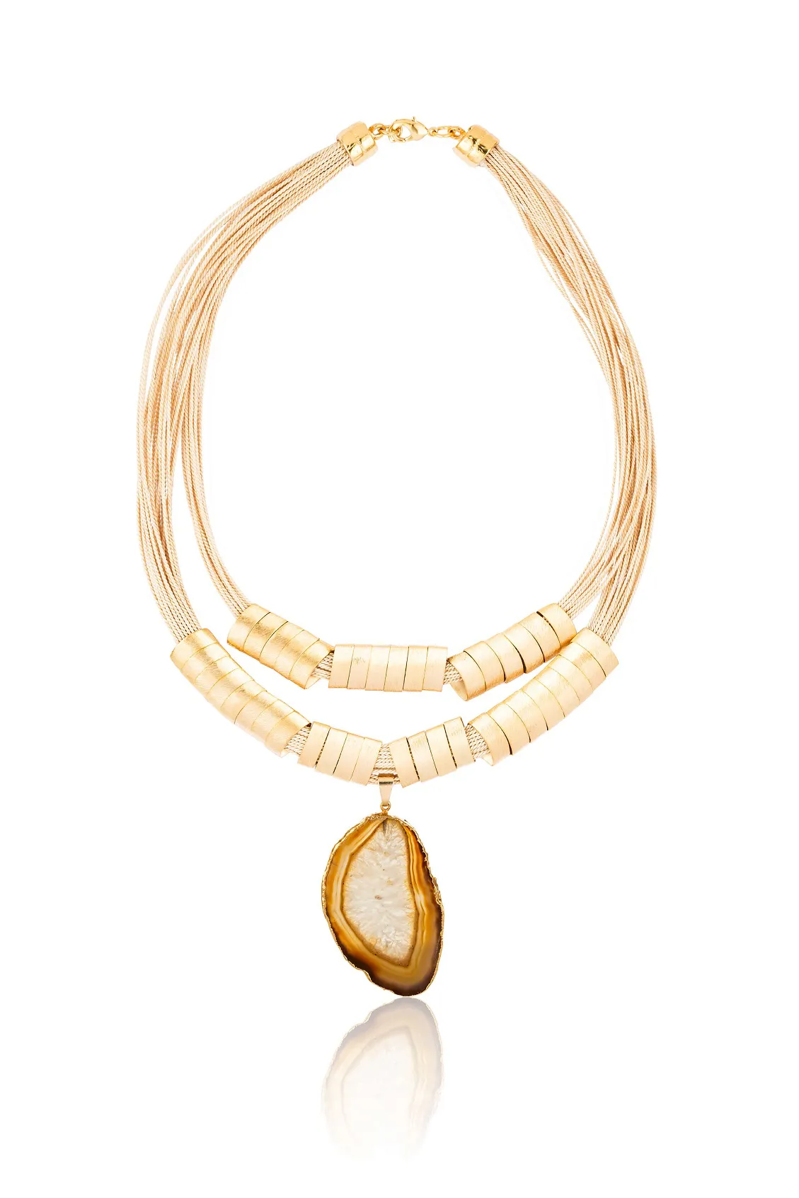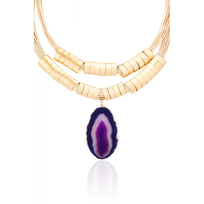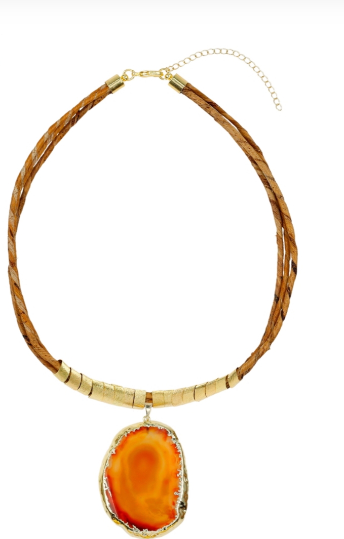 O colar é feito de filetes de Ágata nas cores marrom, roxo, rosa, azul e verde ,temos em palha de buriti ou fibra de bananeira.
