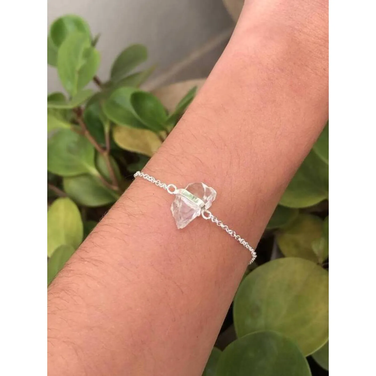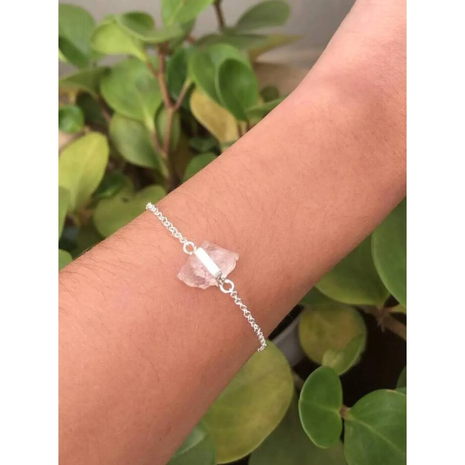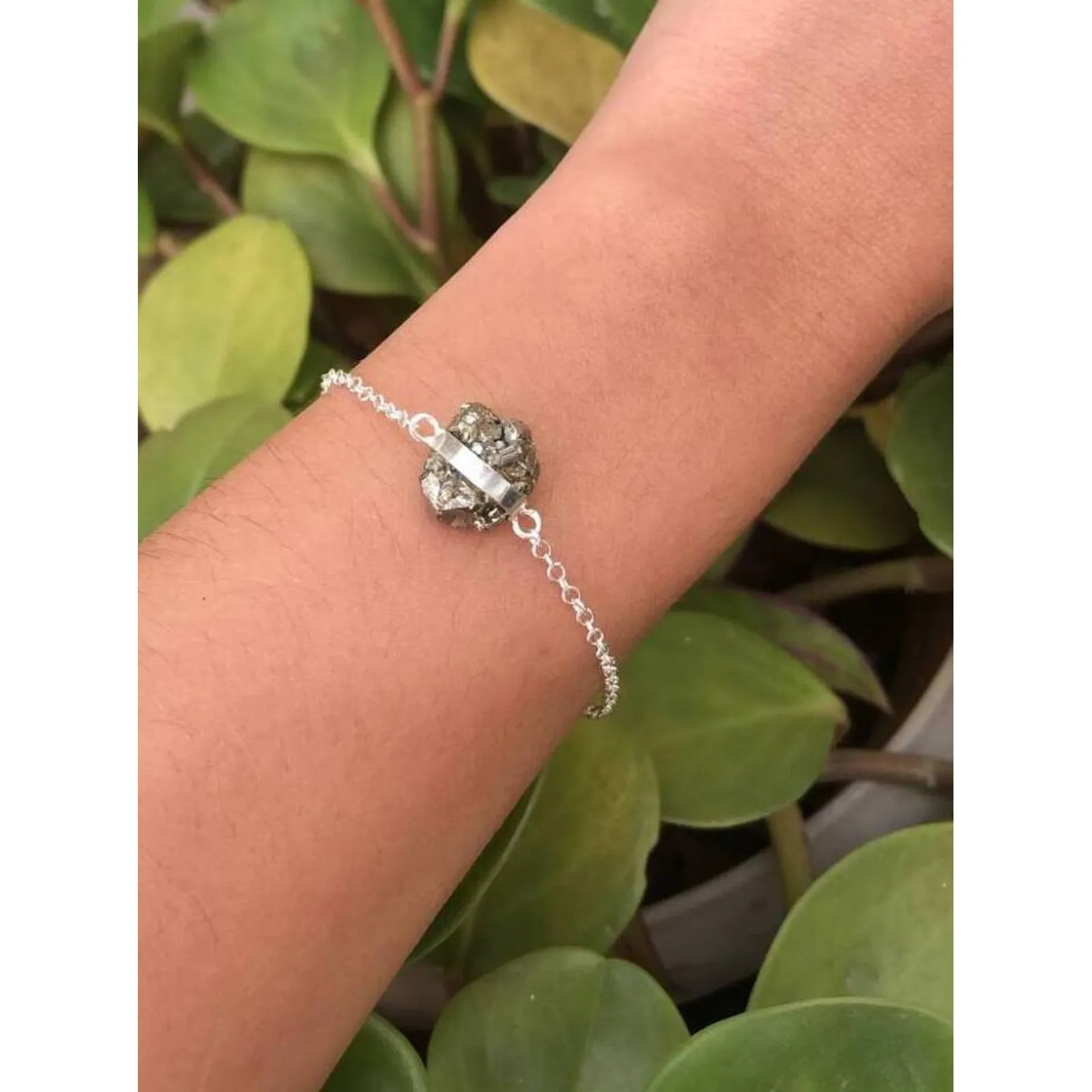 Pulseira na corrente de elo português com pedra bruta natural pirita, quartzo cristal e quartzo rosa.
