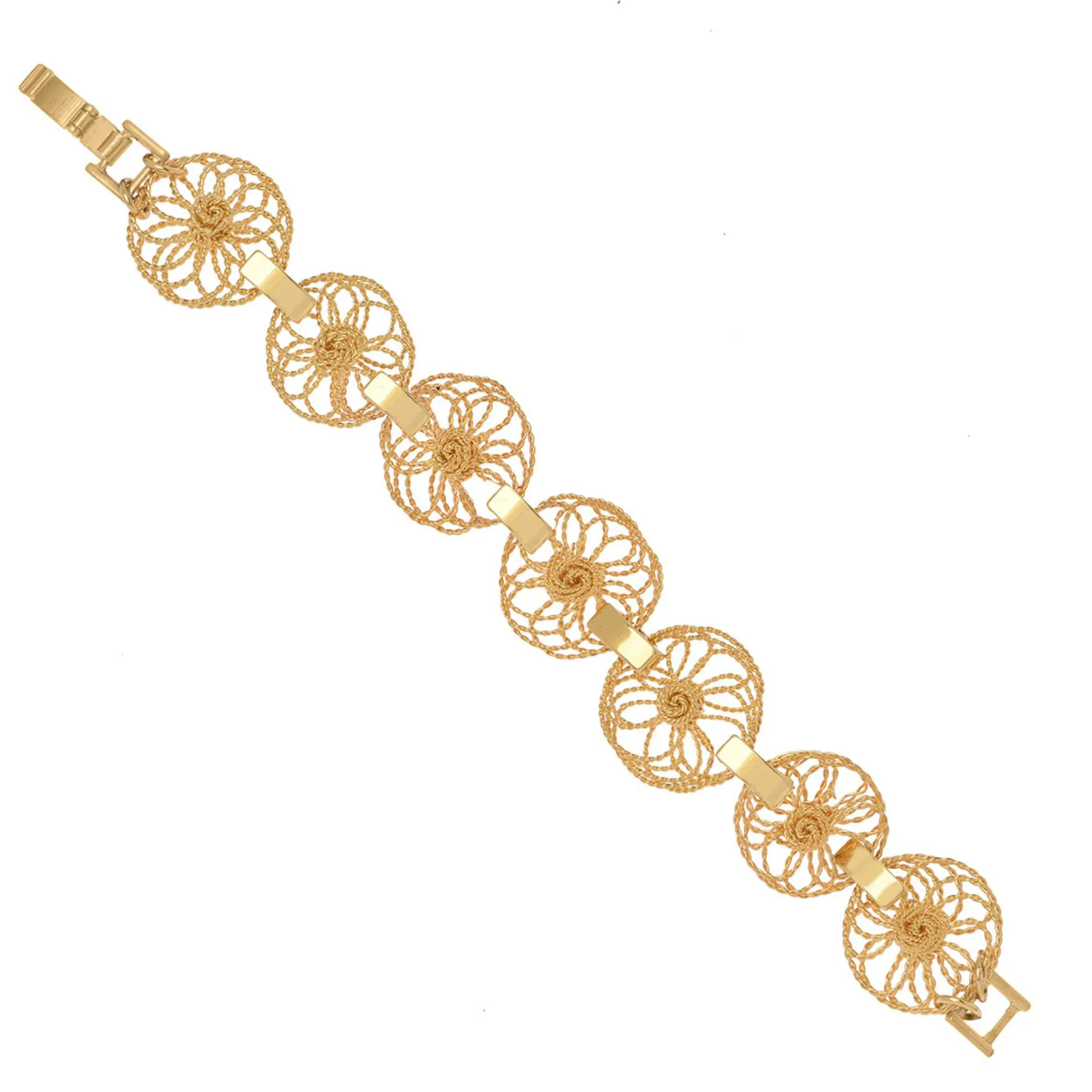 A pulseira é confeccionado em fio de cobre duplamente torcido e banhado a ouro.